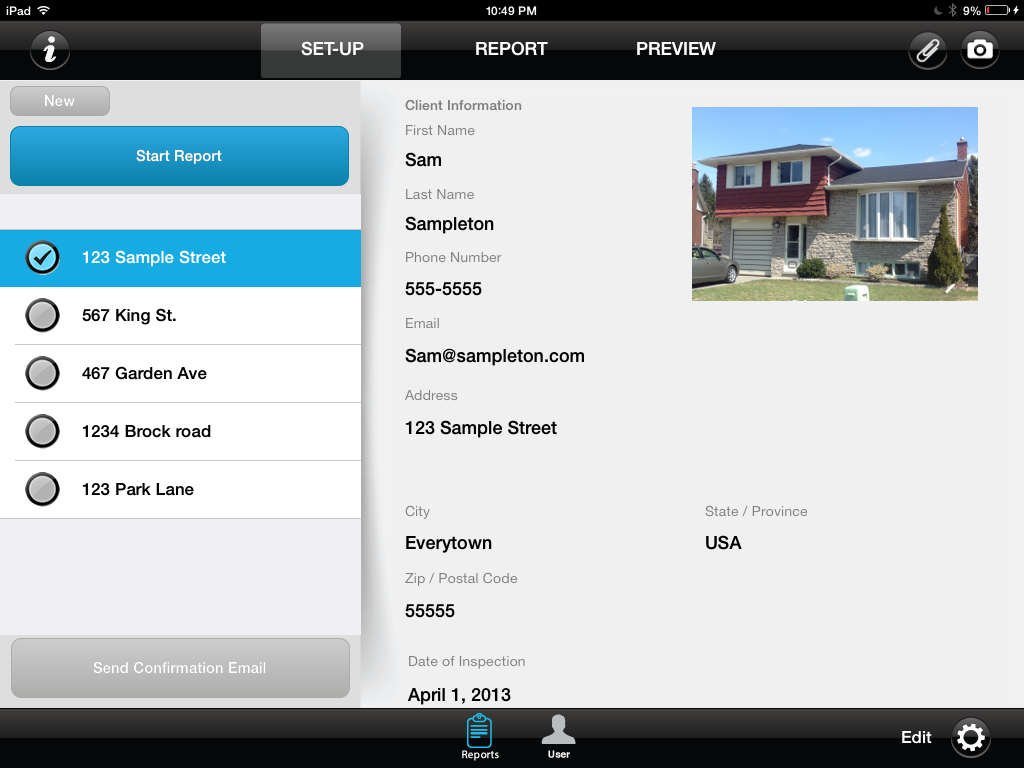 There are 3 main sections in the app: SETUP, REPORT & PREVIEW. Most of the inspection is done in the Report area, but first, start in Set-up.